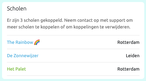 In de Bestuur App kun je zien welke scholen zijn gekoppeld aan de bovenschoolse omgeving. Ontbreekt er een school of moet er een school verwijderd worden? Neem dan contact op met Support.