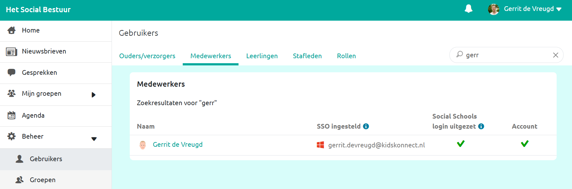 Maar hoe kun je dit centraal monitoren? Met de Bestuur App kun je controleren of de medewerkers een Single Sign On (SSO) inlog hebben geactiveerd en/of of het inloggen met de Social Schools-logingegevens is ingeschakeld of uitgeschakeld. Dit kun je zien via Beheer > Gebruikers > Medewerkers.